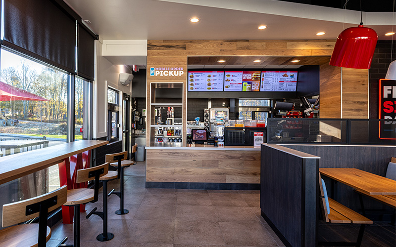 JJWelch completed the ground-up construction of the new Wendy’s in Leicester, MA, delivering the project in 22 weeks. The restaurant includes a drive-through and an exterior patio, along with a bold exterior palette that brings strong red accents and warm material tones to the site. Inside, the space features a bright, modern dining room with.